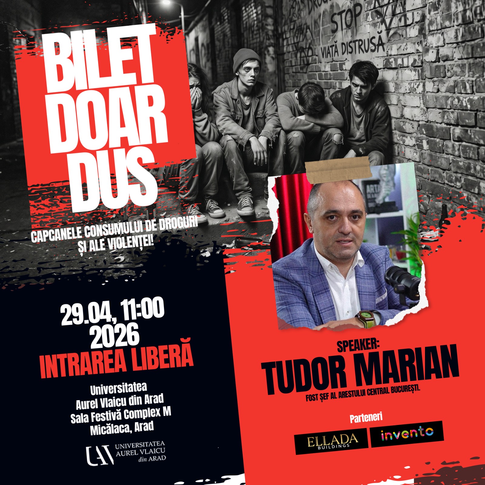 Universitatea „Aurel Vlaicu” din Arad va găzdui marți, 29 aprilie 2026, de la ora 11:00, în Sala Festivă Complex M, Micălaca, evenimentul „Bilet doar dus – Capcanele consumului de droguri și ale violenței”, dedicat conștientizării riscurilor asociate consumului de substanțe interzise și comportamentelor violente.