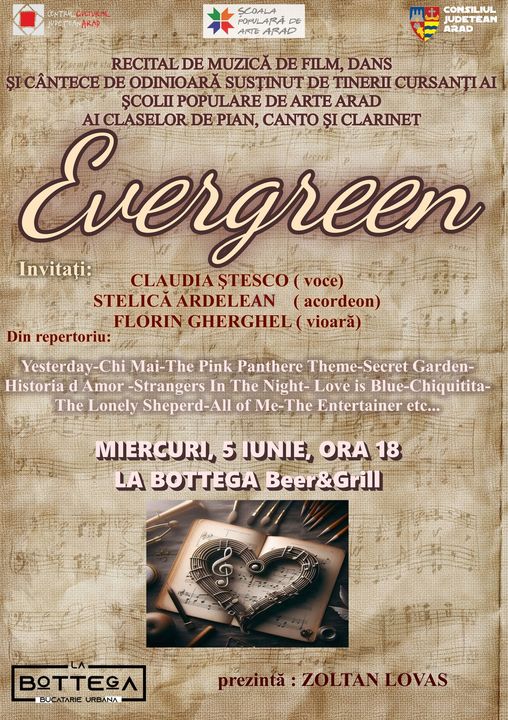 Tinerii talentaţi ai ŞCOLII POPLARE DE ARTE, cursanţi ai claselor de pian ( clasele prof. MARIA HOROSNI, prof. ANDREEA DEMETER , prof. LOREDANA CICIREAN , prof. IOANITA MIHALYCSEK ), clasa de clarinet ( prof. PETRICĂ SPINARE ) şi clasa de canto muzică uşoară ( prof. CLAUDIA ŞTESCO) la RECITALUL DE MUZICĂ DE FILM, DANS ŞI CÂNTECE DE ODINIOARĂ ” EVERGREEN ”