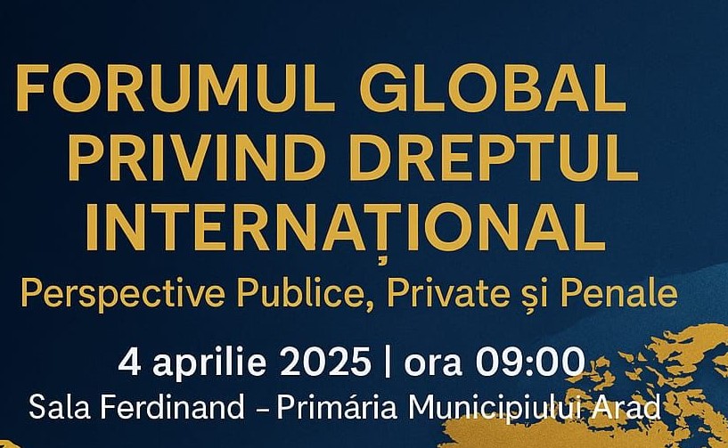 Vineri, 4 aprilie, în sala Ferdinand din Palatul Administrativ, va avea loc „Forumul Global privind Dreptul Internațional: perspective publice, private și penale” eveniment organizat de Institutul de Studii Geopolitice din cadrul Universității ,,Aurel Vlaicu” din Arad. Vor participa specialiști în domeniul dreptului internațional din România, Serbia, Italia, Slovenia, Spania, Germania, Croația, Marea Britanie și Statele Unite ale Americii.