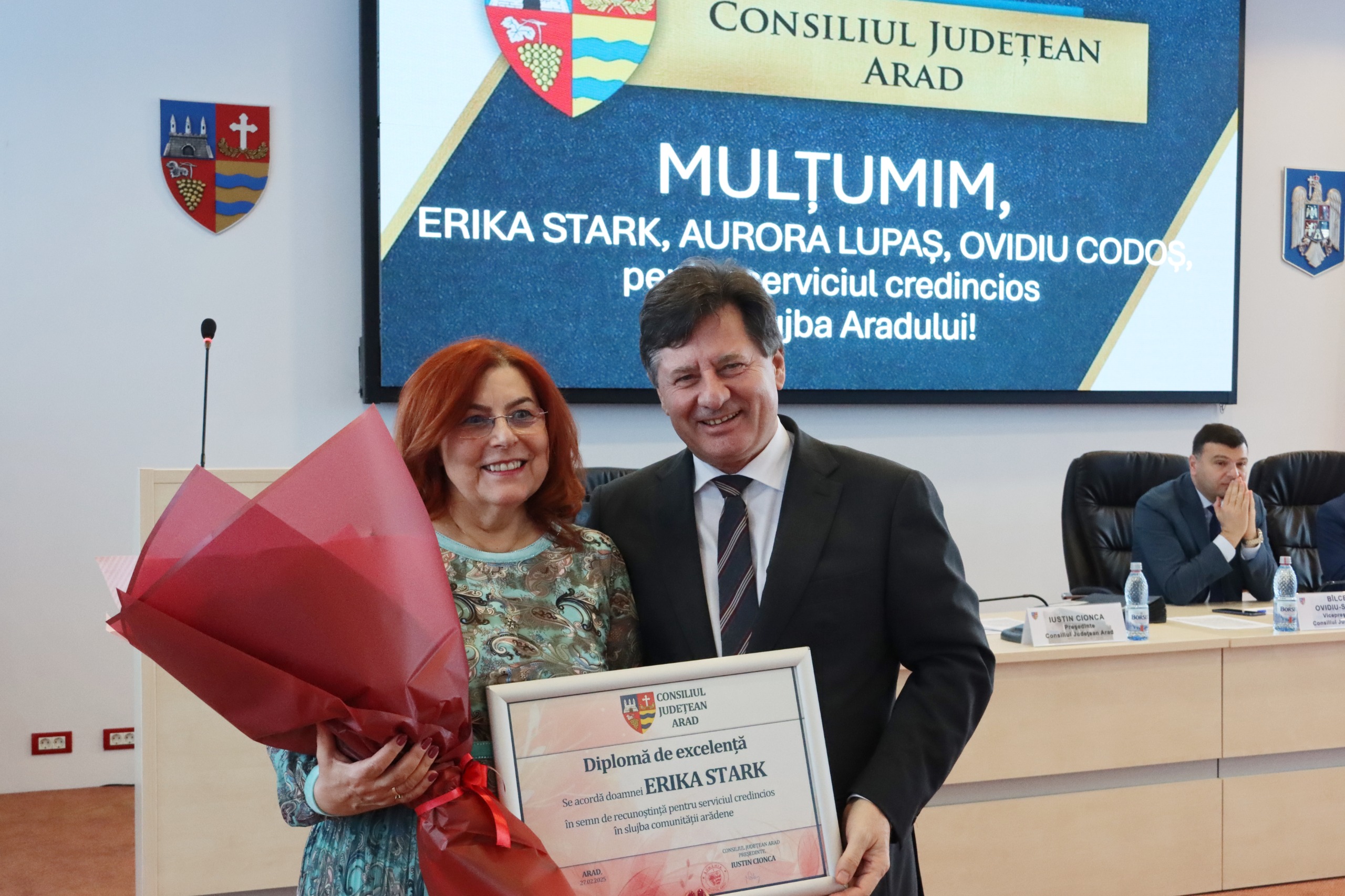 Erika Stark – director al Direcției Județene de Asistență Socială și Protecția copilului, Aurora Lupaș – șef Serviciu în cadrul Direcției Județene de Asistență Socială și Protecția copilului și Sorin Ovidiu Codoș – director al Direcției de Protecție și Pază, au primit astăzi, din partea conducerii Consiliului Județean Arad, Diploma de excelență pentru întreaga activitate, în semn de apreciere pentru dedicarea și profesionalismul lor, recunoscându-li-se astfel contribuția în comunitatea arădeană.
