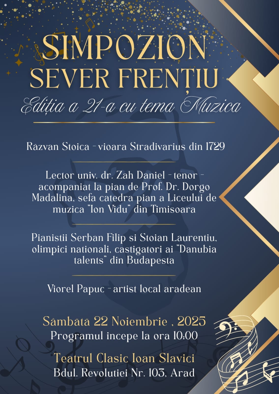 Tot în 22 noiembrie, de la ora 10:00, Aradul găzduiește Simpozionul “Sever Frențiu”, ajuns la cea de-a XXI-a ediție. Evenimentul aduce în prim-plan tema muzicii, reunind artiști consacrați și tineri talentați într-un program de excepție.