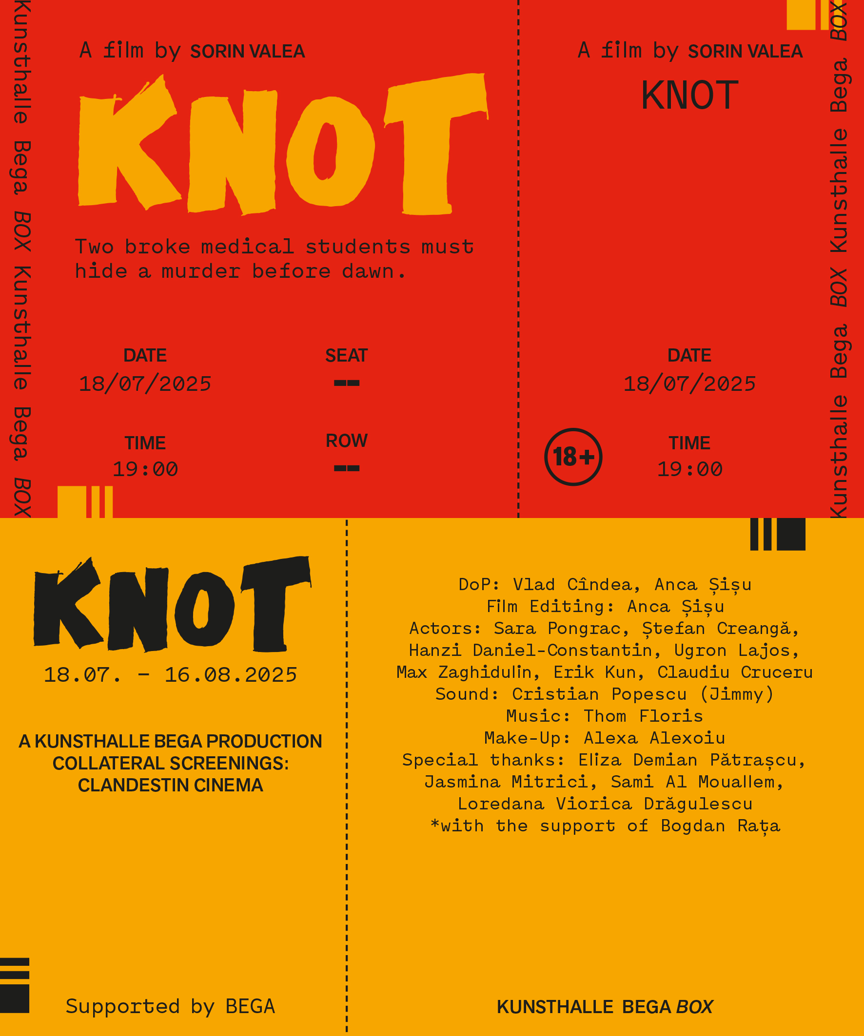Knot este un thriller psihologic cu tușe de umor negru, ancorat în realitatea unei alte generații de sacrificiu. Inspirat dintr-un caz real, filmul urmărește doi studenți la medicină, prinși în criza economică a anilor 2009-2010.