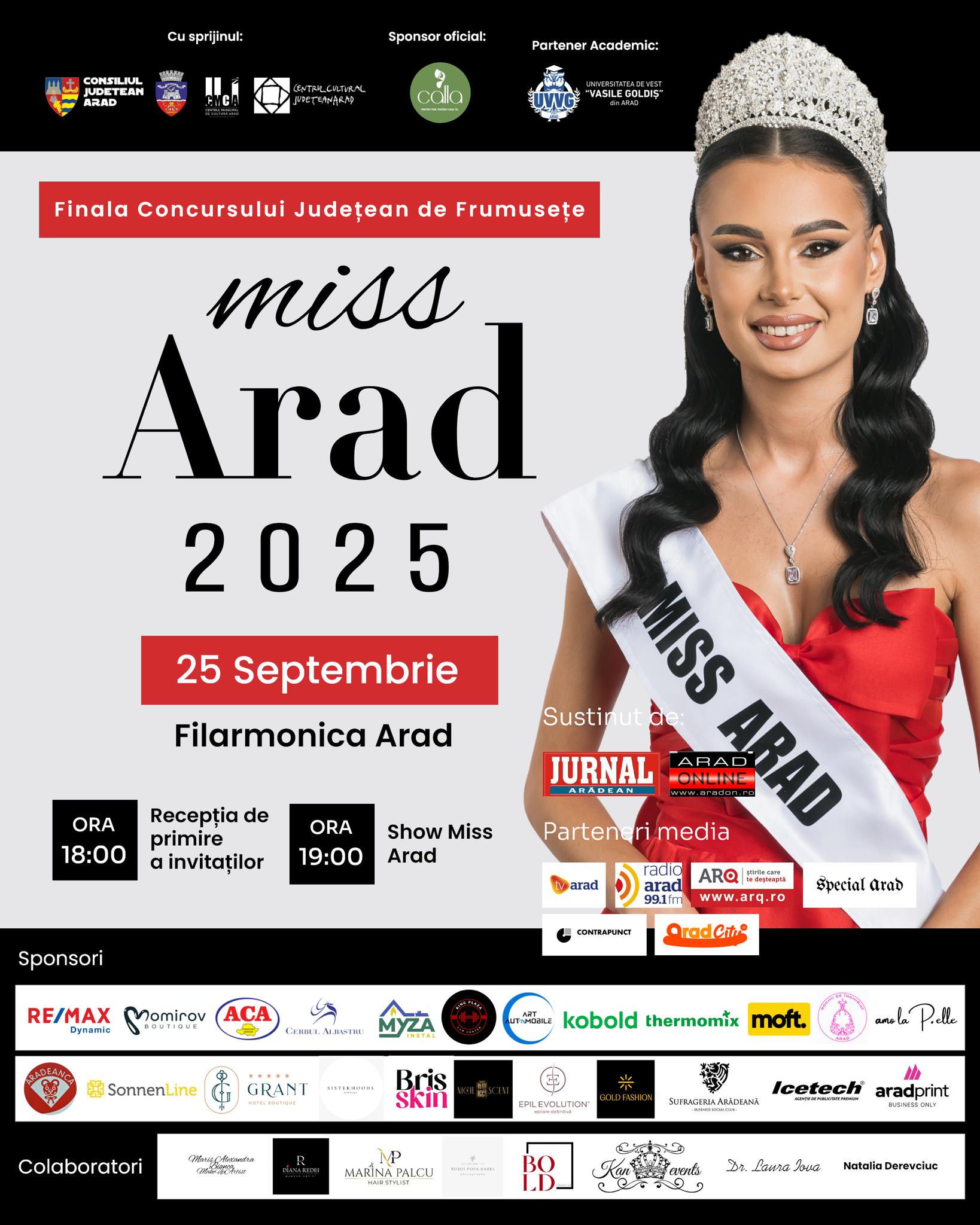 Finala Concursului Județean de Frumusețe Miss Arad este susținută de Primăria municipiului Arad, Centrul Municipal de Cultură Arad, Consiliul Județean Arad și Centrul Cultural Județean Arad.