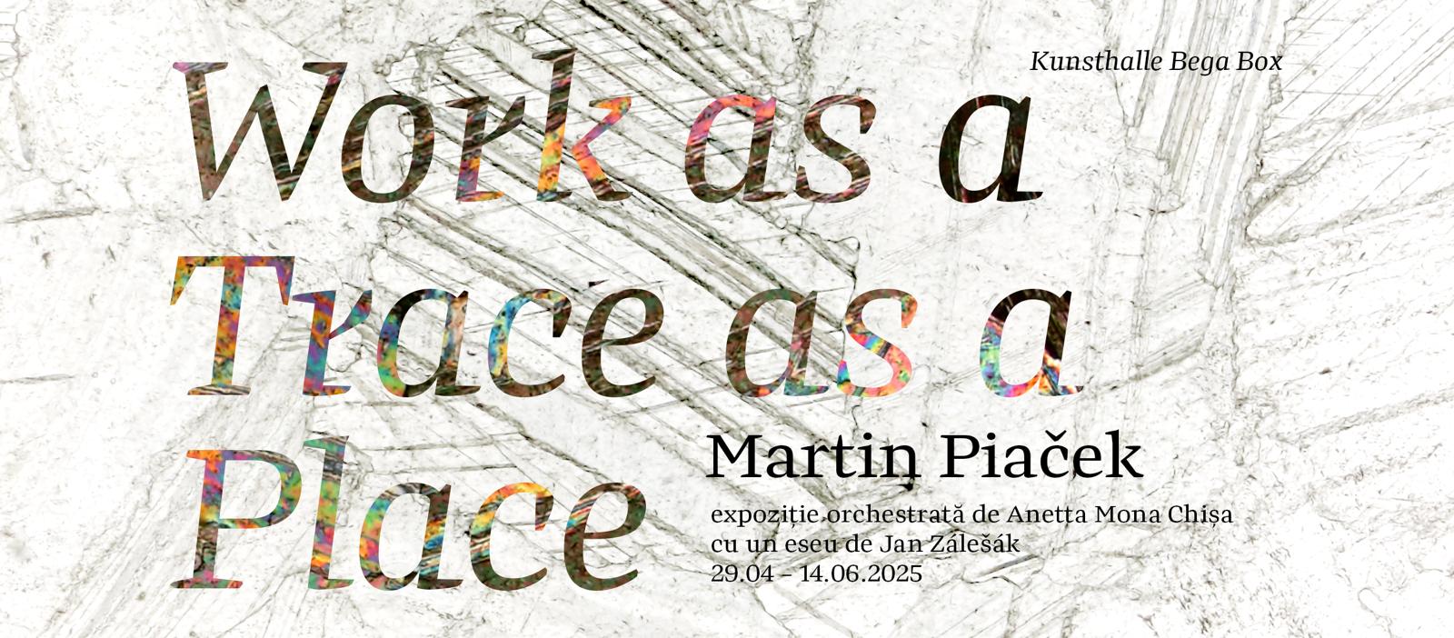 Expoziția intitulată Work as a Trace as a Place reunește câțiva ani de explorare ai artistului, ani în care Martin Piaček s-a aplecat asupra contrastului dintre moale și solid, urmărind călătorii materiale cartografiate în piatră: de la sedimente la calcar și la forma cristalină, de la munte la atelier și apoi în spațiul galeriei, de la blocul brut la obiectul sculptat. Totodată, sunt reflectate istoriile de mediu încorporate în fiecare piesă — golul lăsat în urmă în carieră, praful inhalat de artist, viitorul incert al acestor forme pe măsură ce își continuă evoluția materială.